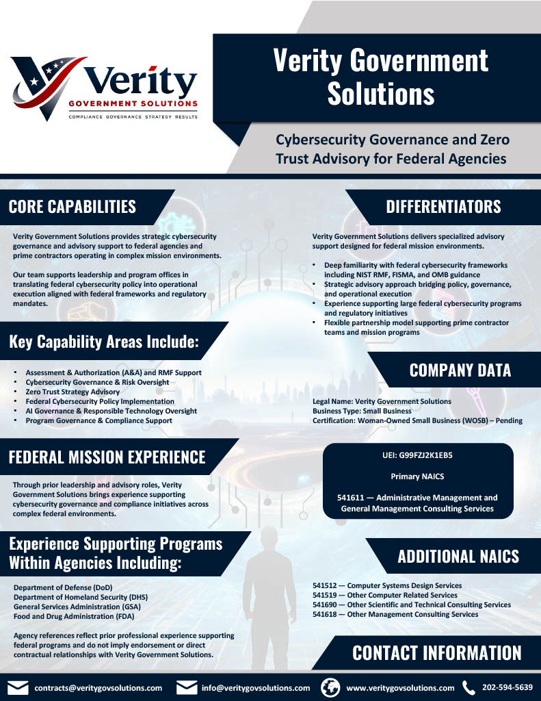 Verity Government Solutions delivers advisory and oversight services supporting enterprise cybersecurity strategy, modernization initiatives, and structured federal program execution.